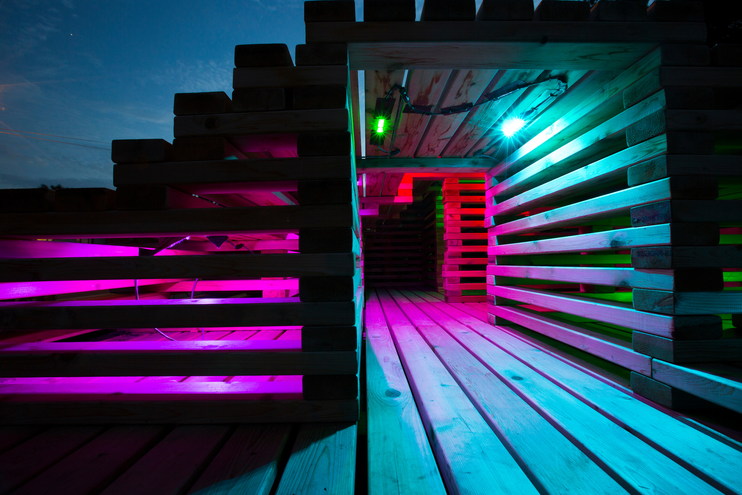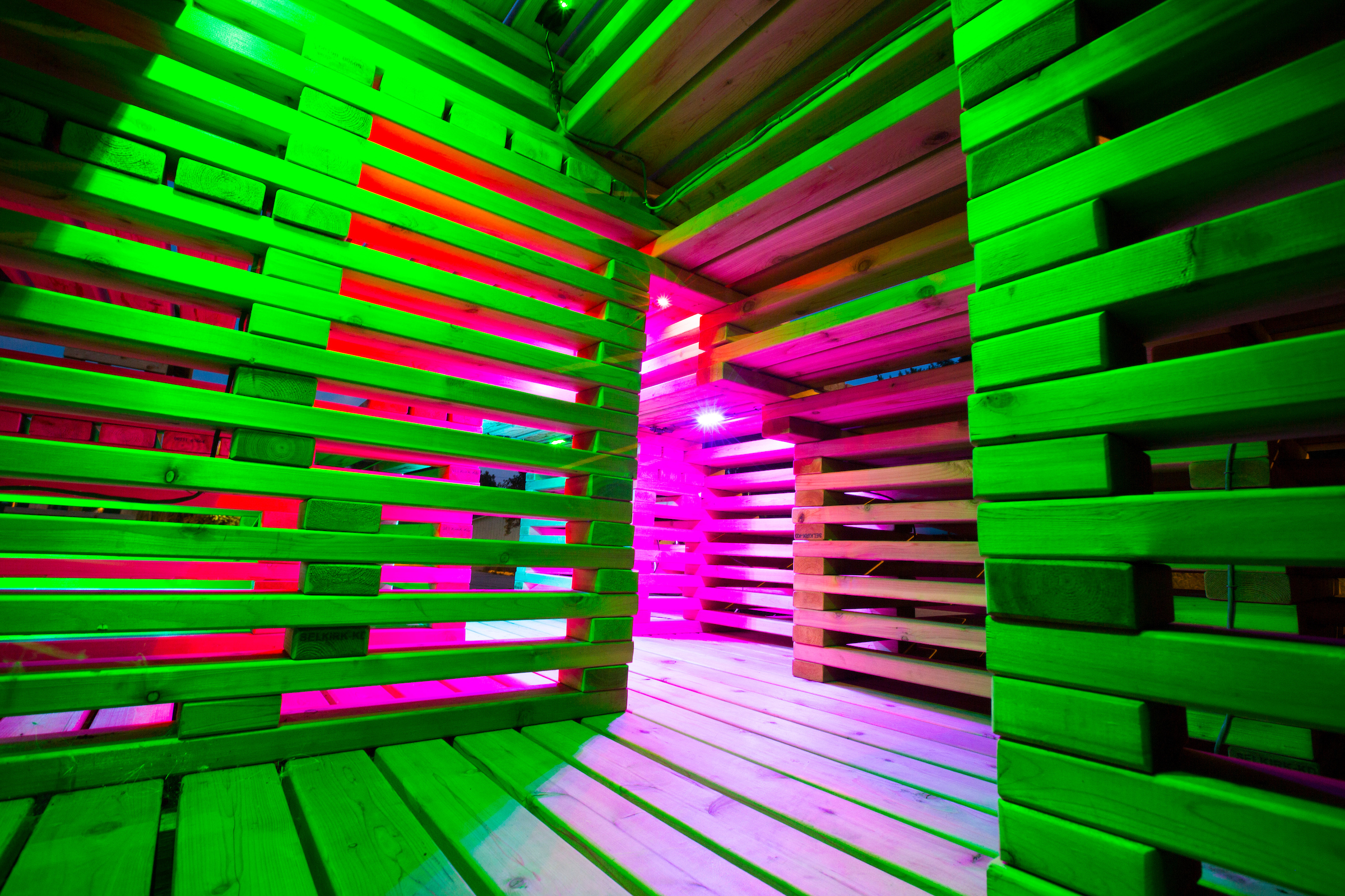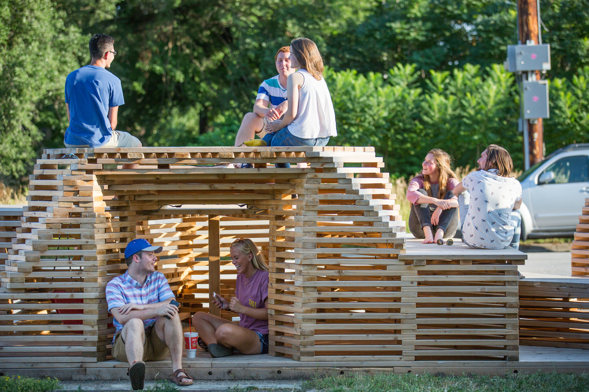 SHIFT is a large-scale design-build installation created in 2017 by 86 second-year architecture students and faculty at Iowa State University. Located on campus, the cedar structure features layered horizontal elements that invite sitting, climbing, and exploration. Designed for interaction, SHIFT engages users with material, light, and space—transforming throughout the day and into the evening through solar-powered LED illumination. The project reflects a collaborative, hands-on approach to architectural education, supported by Reliable St. and a 2017 Fieldstead Studio Outreach Grant.
